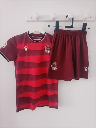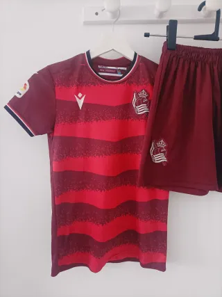 Conjunto de fútbol de la Real Sociedad. - Camiseta de manga corta. - Pantalón corto. - Diseño a rayas.
