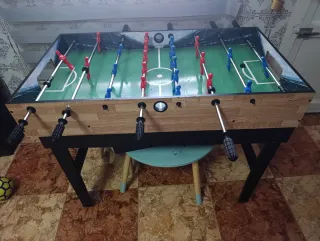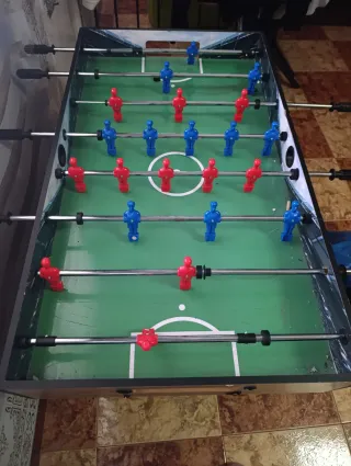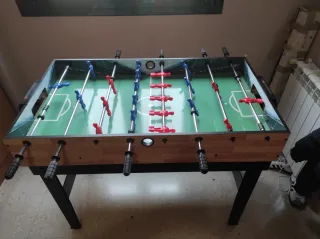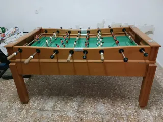 Mesa multijuegos (futbolín,billar,bolos,pin-pon,parchís,Air.....) Futbolín: - Estructura de madera. - Barras metálicas con jugadores. - Asas de agarre negras. Billar: -tacos de madera