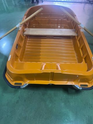Barca naranja de pesca de fibra, ideal para paseos en el agua. Incluye dos remos de madera. - Color naranja brillante. - Construcción robusta. - Asientos integrados para mayor comodidad. - Dos remos de madera incluido. Nunca ha sido utilizada. Precio negociable