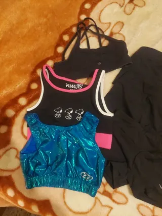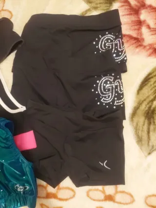 Pantalones de gimnasia negros con un diseño llamativo. - Detalle de pedrería plateada en los laterales. - Logo de la marca en blanco en la parte inferior de una pierna.tops incluidos todo junto 14 e