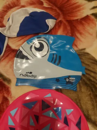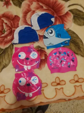 Lote de 6 gorros de natación para niños y ñiñas con diseños divertidos. - tres gorros rosas con diseño de gato. - Un gorro azul con diseño de tiburón. Dos de tela - Material de silicona.