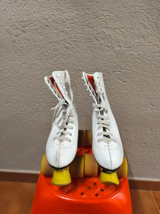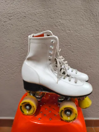 Patines artísticos de la marca Boomerang, bota blanca y ruedas amarillas. Poco usados.Talla 37 Bolsa y fundas patines.