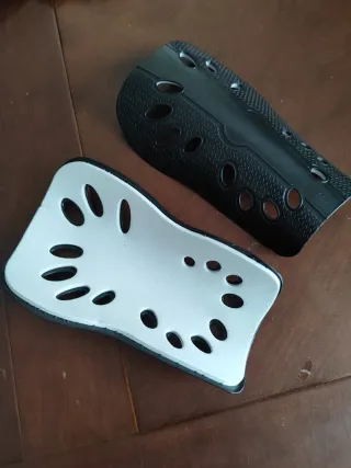 Par de espinilleras deportivas negras, ideales para proteger tus piernas durante la actividad física. - Diseño con múltiples orificios para ventilación. - Material resistente y duradero. - Color negro. Nuevas estrenar Puedes mirar en mi perfil mas ofertas gracias