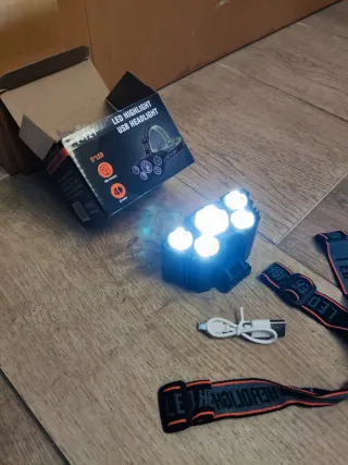 Foco frontal LED USB, ideal para actividades al aire libre o trabajos que requieran iluminación manos libres. Viene en su caja original. - 5 LED de alta luminosidad. - Carga vía USB. - Incluye cinta para la cabeza y cable de carga. Nuevo a estrenar Puedes mirar en mi perfil mas ofertas gracias