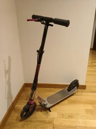 Patinete Oxelo Mid 9 en color negro y rosa. - Manillar ajustable en altura. - Ruedas de 200 mm. - Freno trasero. - Plataforma ancha.