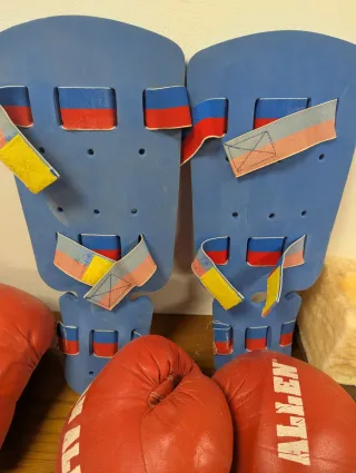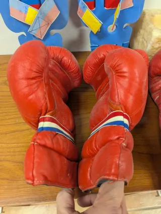 Se venden dos pares de guantes de boxeo de color rojo. Regalo 1 par de protecciones espinilla y empeine azul - Material: Piel. - Diseño clásico con detalles de bandas tricolor (rojo, blanco, azul) en la muñeca.
