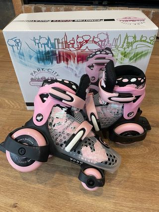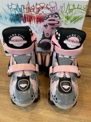 Patines evolutivos de la marca Park City en color rosa y negro. Perfectos para aprender a patinar. En muy buen estado , con muy poco uso. - Talla ajustable de 30 a 33. - Diseño con estampado floral. - Cierre de velcro y hebilla.