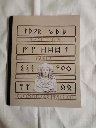 Libreta con diseño inspirado en la cultura ibera. Presenta una portada con inscripciones y una figura decorativa. - Cubierta con motivos ibéricos. - Incluye una imagen de una figura histórica. - Diseñada para práctica de escritura o estudio.