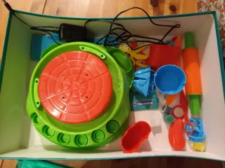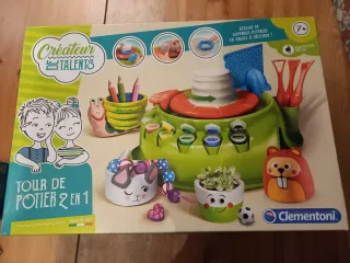Juego de alfarería Clementoni para crear y decorar piezas de arcilla. - Incluye torno de alfarero eléctrico. - Set de herramientas para modelar y decorar. - Pinturas y accesorios para personalizar las creaciones. - Fabricado en Italia. En la foto hay restos de arcilla, se quitan fácilmente con agua, lo limpiaré antes de enviar.