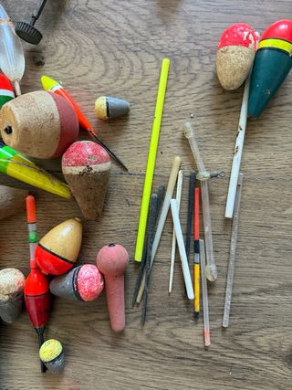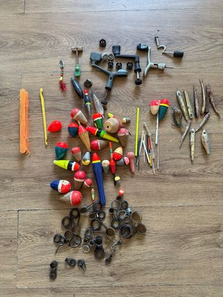 Conjunto variado de accesorios para la pesca, todos usados pero aun se les puede dar mucho uso, bollas de diferentes medidas, manetas de carrete, señuelos usados con marcas de uso y con algunas faltas, consulta fotos detalladamente, son parte de la descripción - Flotadores bollas de diferentes tamaños y colores, con marcas de uso y a la mayoria les falta el palo - Anillas y guías para cañas de pescar de diferentes medidas, - Señuelos con bastantes marcas de uso y alguna falta y otros aparejos. - Herramientas pequeñas para pesca.