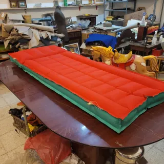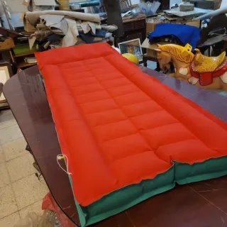Colchoneta inflable de estilo vintage, ideal para camping o actividades al aire libre. Su diseño combina colores vibrantes para un toque retro. - Color principal: rojo. - Base de color verde. - Material resistente. Hay 3 colchonetas en total