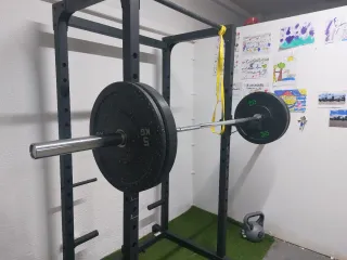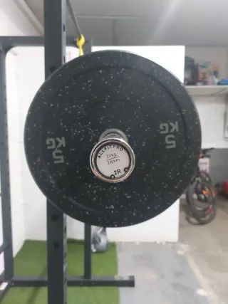 Barra olímpica con discos de peso para entrenamiento. - Barra de acero cromado. - Discos de 20 kg y 5 kg. - Ideal para gimnasio en casa.