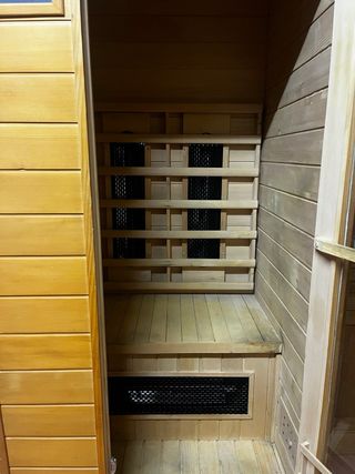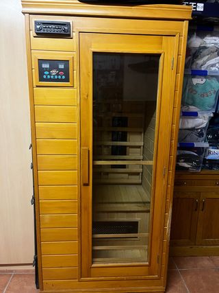 Sauna de madera con puerta de cristal y panel de control. - Fabricada en madera de alta calidad. - Puerta con ventana de cristal. - Panel de control digital para ajustar la temperatura y el tiempo.
