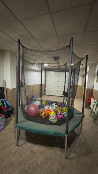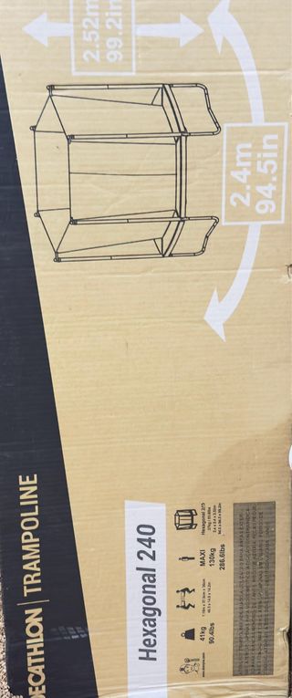 Cama elástica hexagonal marca Decathlon, modelo 240. - Diámetro: 2.4m (94.5in) - Altura: 2.52m (99.2in) - Peso máximo usuario: 130kg (286.6lbs) - Peso del producto: 41kg (90.4lbs)