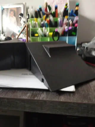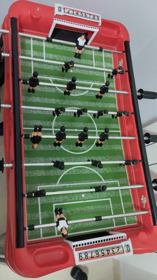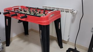 Futbolín de tamaño infantil, perfecto para los más pequeños de la casa. Su diseño llamativo en rojo y negro lo hace muy atractivo. - Estructura de plástico resistente. - Barras con jugadores. - Patas negras estables. Le falta la paleto y las piezas que hacen de camiseta. Y una de las porterias está un poco floja. Pero son detalles sin importancia