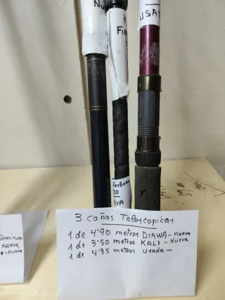 Lote de tres cañas de pescar telescópicas. - 1 caña DIAWA de 4.90 metros, nueva. - 1 caña KALI de 3.50 metros, nueva. - 1 caña de 4.35 metros, usada.