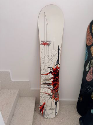 Tabla de snowboard Atomic 160 con un diseño llamativo en blanco y rojo, junto con un par de botas de snowboard. La tabla tiene uso pero está perfecta para empezar o como otra opción. Las botas solo tienen 2 usos son un 43. La tabla tiene alguna marca que puedes ver en las fotos pero en buen estado. - Tabla de snowboard Atomic. - Botas de snowboard.