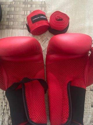 Set de guantes de boxeo rojos de 4 oz junto con vendas. - Guantes de boxeo rojos. - Vendas de boxeo rojas.