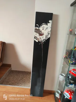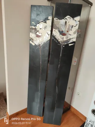 Set de dos lienzos decorativos con un diseño de flores abstractas en tonos grises, blancos y toques rojizos. El fondo es oscuro, creando un contraste llamativo. - Diseño moderno y elegante. - Ideal para dar un toque artístico a cualquier estancia. - Cada lienzo tiene un formato alargado.