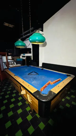 Se vende mesa de billar americano con su lámpara colgante. - Mesa de billar con paño azul. - Lámpara colgante de dos focos verdes.tiene algunos desperfectos por robo de hucha,y el tapete no esta sucio,precio negociable,medidas mesa ancho 1320mm,alto 850mm,largo 2320mm