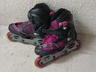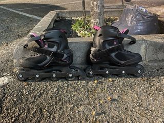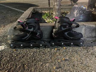 Se venden patines en línea en color negro con detalles en rosa. - Cierre de velcro y hebilla. - Ruedas de poliuretano. - Bota acolchada para mayor comodidad. Muy poco uso.