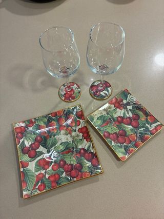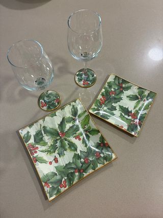 Conjunto de dos copas de vino y dos platos cuadrados, ambos con un bonito diseño de acebo y bayas rojas, ideal para la temporada navideña. El borde de los platos y la base de las copas tienen un detalle dorado. - Diseño de acebo y bayas rojas. - Borde dorado en los platos. - Base dorada en las copas. - Hechos por mi a mano