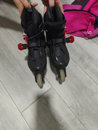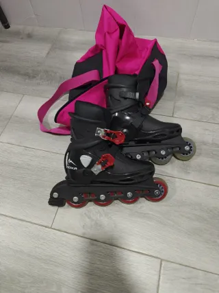 Estos patines en línea son perfectos para los más pequeños. Su diseño combina el negro con detalles en rosa, haciéndolos atractivos y funcionales. - Cierre de hebilla y velcro para un ajuste seguro. - Ruedas resistentes para un deslizamiento suave. - Bota acolchada para mayor comodidad. - adaptables talla de la 33 a la 36 (34 y 35)
