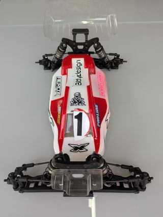Coche radiocontrol XRAY XB2-24 en excelente estado, prácticamente nuevo. Listo para la acción. - Diseño deportivo en blanco y rojo. - Detalles de patrocinadores como BittyDesign, Pro-Line y Hobbywing. - Número 1 destacado en la carrocería. - Ala trasera transparente. - Componentes de suspensión de alta calidad.
