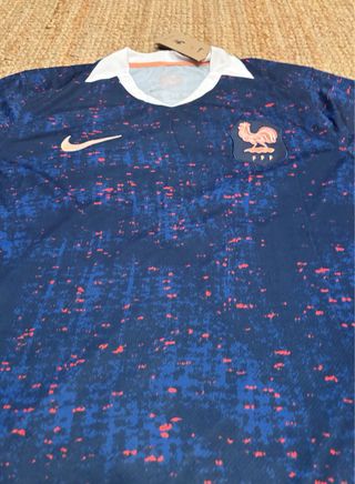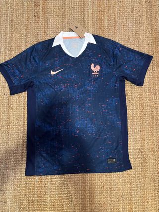 Camiseta de la Selección Francesa de fútbol, primera equipación, de la marca Nike. Nueva a estrenar. - Diseño moderno en azul con detalles. - Escudo de la selección bordado. - Logo de Nike. - Cuello blanco con detalles naranjas.