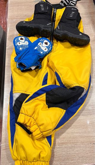 Conjunto de ropa de nieve para niños, ideal para mantenerse abrigado y seco en la montaña. Incluye botas y manoplas. - Botas de nieve negras con cierre de velcro n* 24 - Manoplas azules con diseño de erizo. - Pantalón de nieve amarillo con detalles en azul y negro. Todo fue usado en una ocacion unicamente