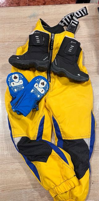 Conjunto de nieve TEX para niños de 2 a 4 años. Ideal para mantenerlos abrigados y secos en sus aventuras invernales. - Diseño de dos piezas: chaqueta y pantalón. - Chaqueta con capucha y forro interior. - Pantalón con tirantes - Botas de nieve negras Decathlon talla 26-27 incluidas. Lo ha usado solo 2 veces, está como nuevo!!!