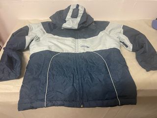 Conjunto de ropa de esquí para mantenerte abrigado y seco en la montaña. Incluye chaqueta y pantalón. Talla 48 ideal debutantes - Chaqueta de dos tonos azul y gris. - Diseño con capucha. - Pantalón a juego.