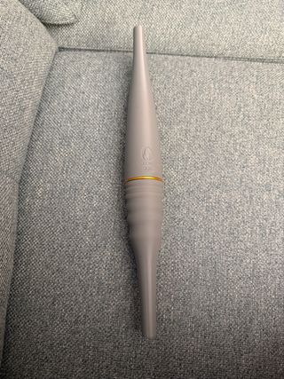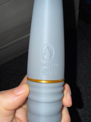 Réplica de la antorcha olímpica de París 2024, impresa en 3D. Un objeto de colección conmemorativo. - Diseño inspirado en la antorcha oficial. - Acabado en color gris mate. - Detalles dorados. - Símbolos de París 2024 y los anillos olímpicos.