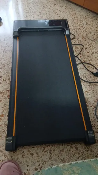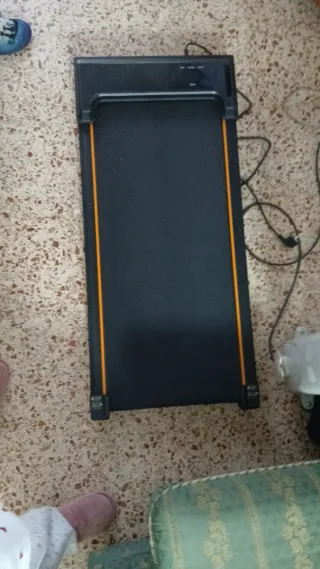 Cinta de caminar eléctrica en color negro con detalles naranjas. - Diseño compacto y moderno. - Panel de control superior. Se recoge en mano en Aldaia.