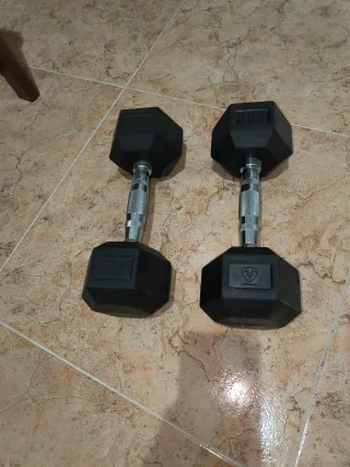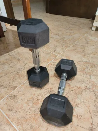 Par de mancuernas hexagonales de 5kg cada una. Ideales para entrenamientos de fuerza. Se han usado 2 veces. Están nuevas. Se venden por no usarlas - Diseño hexagonal para evitar que rueden. - Empuñadura metálica texturizada para un agarre firme. - Peso: 5kg por mancuerna.