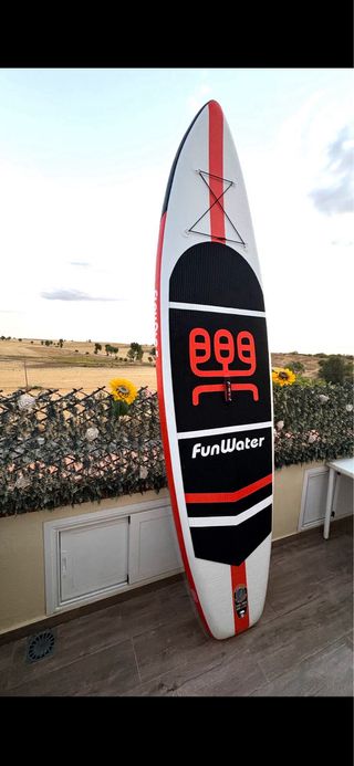 Tabla de paddle surf FunWater con un diseño moderno y llamativo. - Base antideslizante. - Cuerda elástica en la parte delantera para sujetar objetos. - Diseño con franjas rojas y blancas.