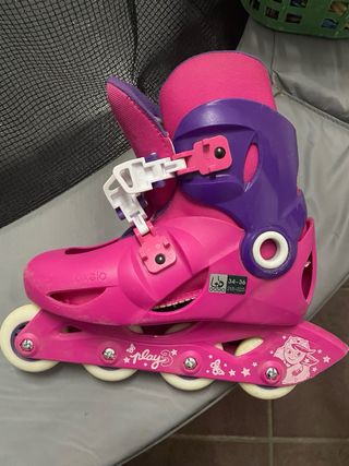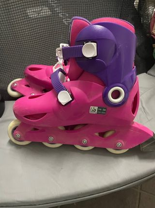 Patines en línea de color rosa y morado, con ajuste de talla. - Talla 34-36. - Ruedas de poliuretano. se regala protección manos, codos y rodillas en negro y rosa usadas.
