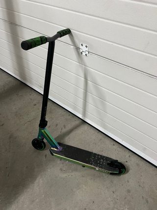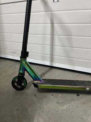 Patinete Invert Supreme con un diseño llamativo y colorido. - Base negra con detalles. - Ruedas negras con aro verde. - Manillar negro.