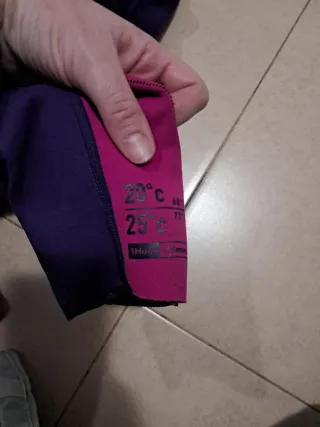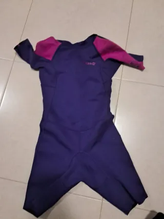 Traje de neopreno para niño, ideal para actividades acuáticas. Presenta un diseño en color morado con detalles en rosa en los hombros y mangas. - Manga larga. - Pierna corta. - Cierre de cremallera en la espalda.
