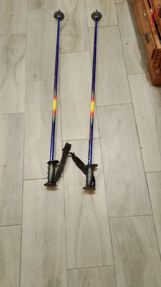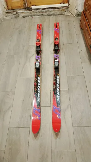 Esquís de la marca Rossignol con un diseño llamativo en rojo y negro. - Esquís con fijaciones. - Diseño con detalles en morado y amarillo.