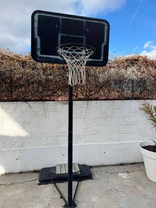 Canasta de baloncesto con altura regulable. - Aro de metal. - Red de nylon. - Base para rellenar con agua o arena.
