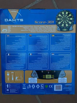 Diana electrónica para dardos con el modelo Score-301. Incluye 25 juegos y 176 variaciones. - Pantalla LCD. - Incluye instrucciones. - Marca Carromco.