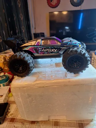 Coche radiocontrolado con tracción 4x4. - tiene una rueda de atrás que gira pero no la llega fuerza del motor, no le impide de correr bien porque las otras tres ruedas funcionan perfectamente. - Diseño deportivo con alerón. - Ruedas todoterreno de gran tamaño. - Carrocería con detalles en morado y azul.