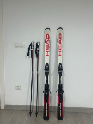 Conjunto de esquís HEAD Super Shape con bastones y Botas incluidas. Pack= 70€ SI COMPRAS POR SEPARADO: -Squies head: 40€ MEDIDAS: 136cm de largo por 11.1 de radio - Palos tecnopro: 20€ - botas head: 40€ - Esquís de color blanco con detalles en rojo y negro. - Bastones negros con empuñaduras rojas y blancas.