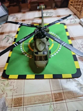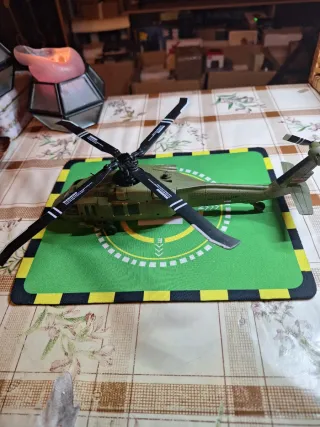 Réplica detallada del helicóptero UH-60 L Black Hawk. - Diseño militar en color verde. - Base de aterrizaje temática incluida.