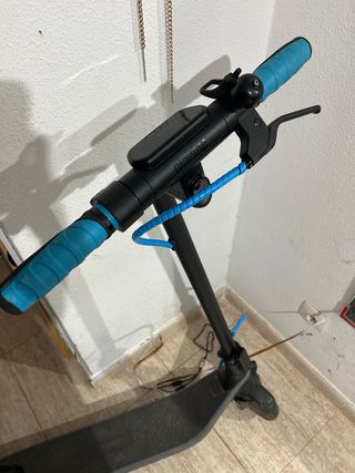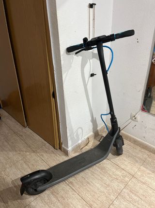Patinete eléctrico de color negro, con detalles en azul en el manillar y cable de seguridad. - Manillar con puños ergonómicos. - Plataforma ancha y antideslizante. - Rueda trasera con guardabarros. - Cable de seguridad azul. -25 km -cargador original -en buen estado -bateria en buen estado