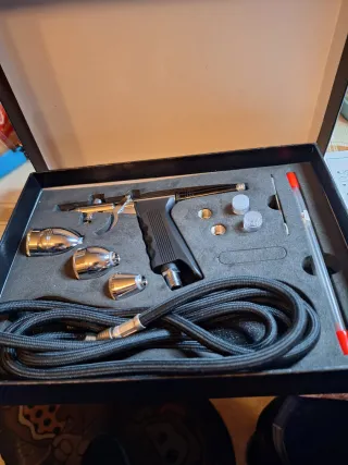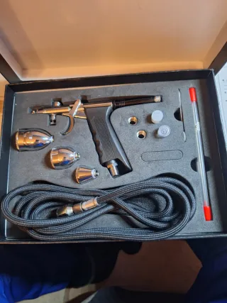 Aerógrafo de la marca AIR BRUSH, ideal para diversas aplicaciones. - Incluye manguera de conexión. - Varios accesorios y boquillas. - Diseño ergonómico.