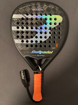 Pala de pádel Bullpadel Hack03. - Diseño con acabado en carbono y detalles naranjas. - Forma de lágrima. - Incluye protector y correa de muñeca. Sin grietas, solo los roces de uso tipicos