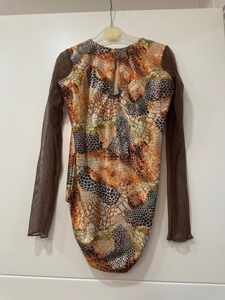 Body de patinaje artístico de la marca Guillermo Bordoy, talla 3 .Diseño con estampado de escamas en tonos naranjas, marrones y dorados, y mangas largas de malla marrón. - Mangas largas de malla. - Estampado de escamas. - Cuello redondo.