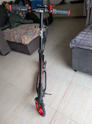 Patinete plegable de color negro con detalles en rojo. - Ruedas de color rojo. - Manillar ajustable. - Plegable para facilitar su transporte.